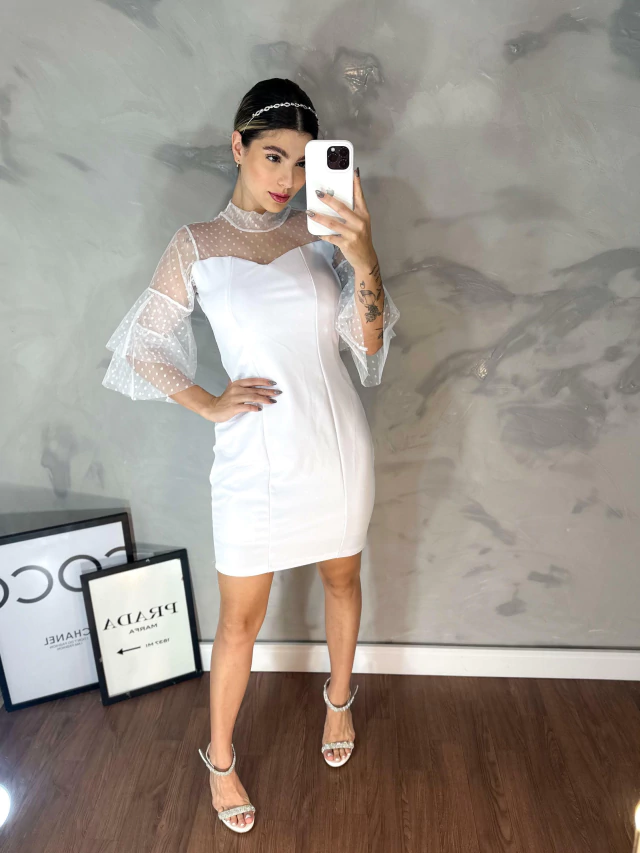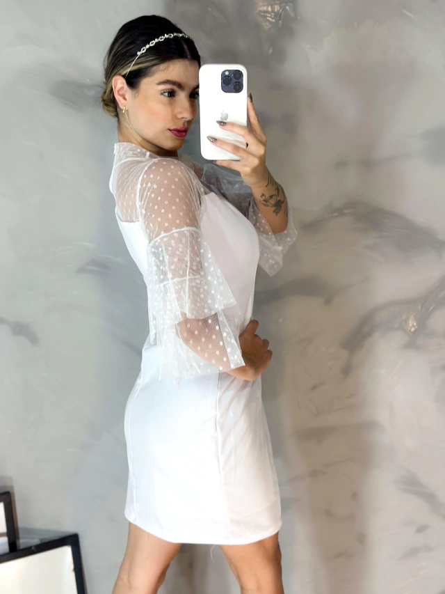 Romántico y moderno, este vestido blanco para boda civil es perfecto para pre-wedding, mini wedding y ceremonias en el registro civil. Confeccionado en neocrepe (tejido de crepé con elasticidad), moldea el cuerpo con estructura y confort. El encanto está en las mangas en capas de tul con lunares (poá) y la gola alta en tul, que aportan ligereza y un toque fashion. Para mayor soporte, incluye copas internas y cremallera trasera. Largo corto — elegante y fotogénico.