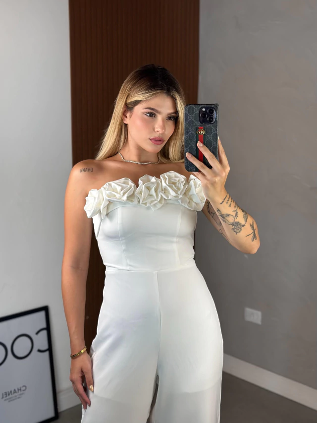 Na região do busto, o macacão é adornado com delicadas aplicações de flores, que adicionam um toque de sofisticação e feminilidade. Essas flores criam um contraste bonito com o restante do design minimalista, conferindo um charme adicional ao visual.