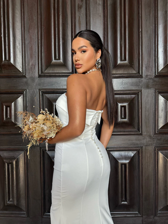 Seu design sem alças valoriza os ombros e o colo, trazendo um toque de modernidade e requinte. A cintura bem marcada destaca a feminilidade, enquanto a saia justa ao corpo, complementada por uma fenda lateral no lado direito, adiciona um charme irresistível ao caminhar.