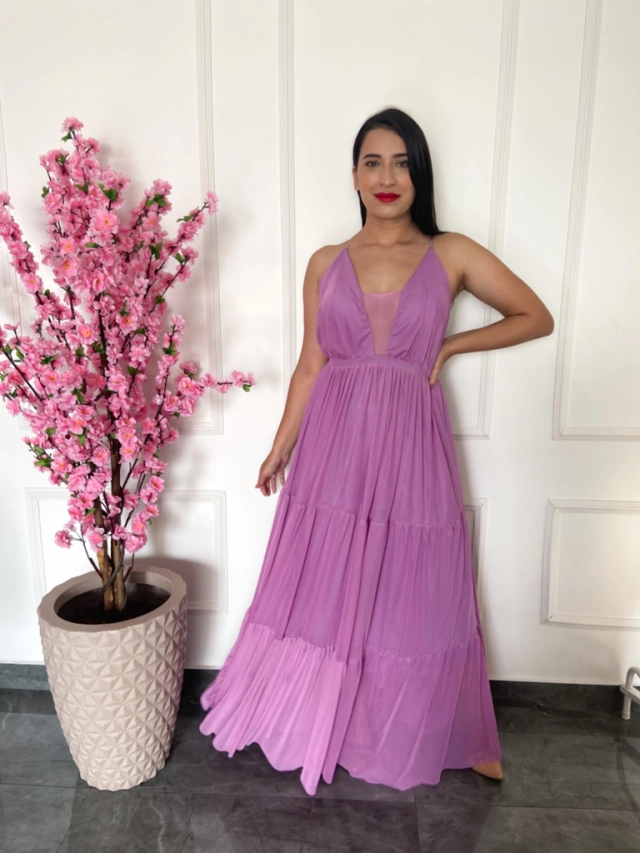 Vestido longo, confeccionado no tule liso, super tendência, com decote profundo e transparência no colo, o vestido já vem com bojo estruturado, detalhe de cintura marcada, saia do vestido tem detalhe de ser plissada tornando este modelo bem leve e fluido, fica super lindo nas fotos. O vestido tem costas nuas, no qual as alças finas do vestido formam um detalhe de X. Este vestido tem um caimento muito bonito, é forrado no tecido elastano veste super bem e valoriza as curvas do corpo.