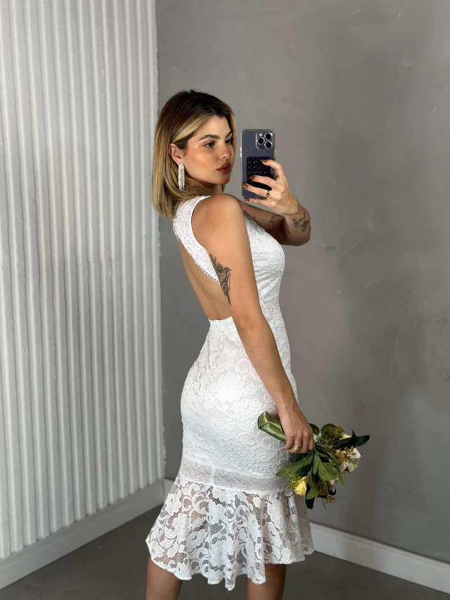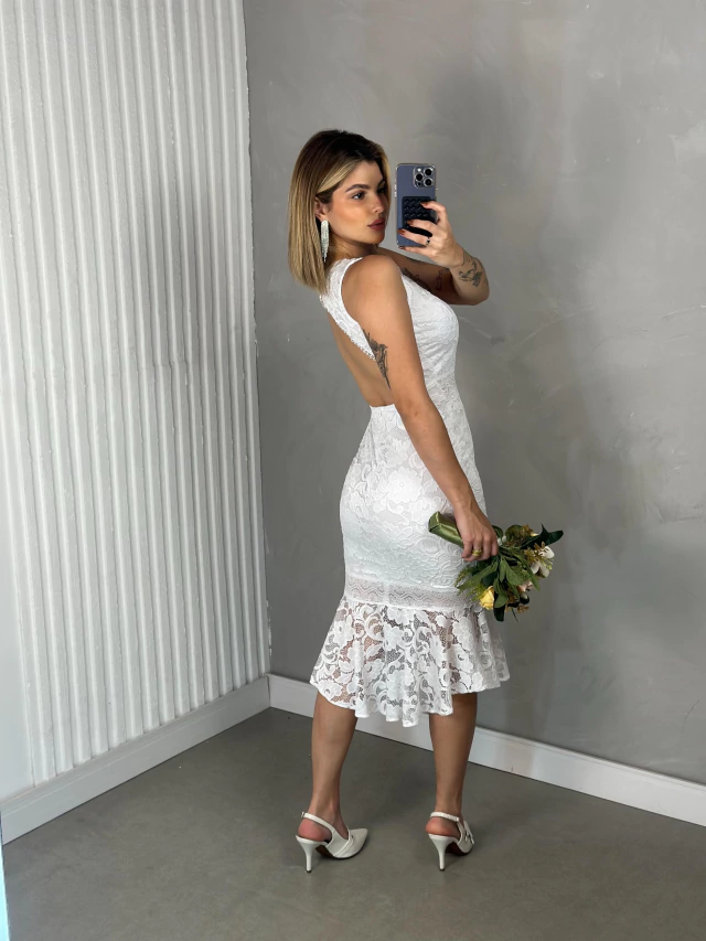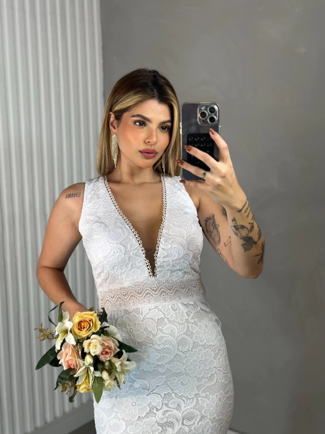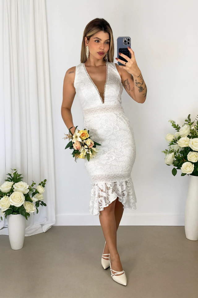 Descubra a sofisticação deste vestido de noiva ideal para casamentos civis. Confeccionado em renda com forro, ele apresenta um decote profundo em V, realçado pelo detalhe em tule e bojo estruturado, que valoriza o busto. Um delicado detalhe de renda, posicionado logo abaixo dos seios, confere um toque romântico à peça. A saia, justa e colada ao corpo, exibe babados na barra, adicionando movimento e graça a cada passo. Nas costas, o decote charmoso revela a pele de maneira elegante, complementado por um fechamento com botões de pérolas nas núncias. Em um deslumbrante branco puro e com comprimento midi, este vestido une tradição e modernidade para tornar seu grande dia ainda mais inesquecível.