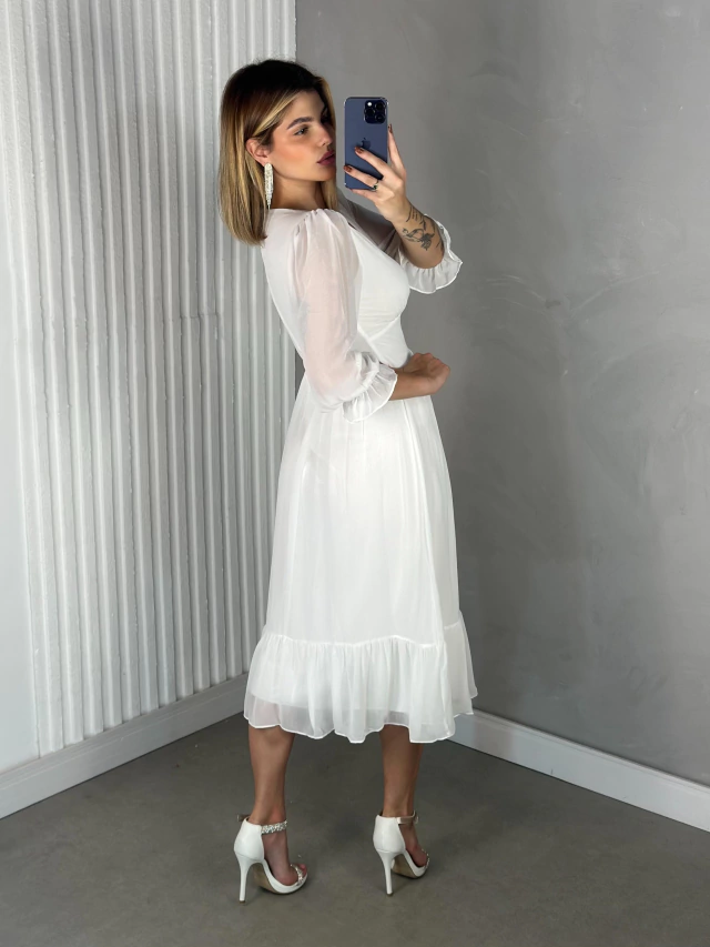 O decote em V, sem bojo, valoriza o colo com naturalidade, enquanto a costura logo abaixo dos seios define a silhueta de forma sutil. As mangas 3/4 trazem um ar romântico e delicado, complementando o design com sofisticação, e a barra com babados adiciona leveza ao movimento. A cintura marcada desenha a figura da noiva, enquanto a saia evasê com babados na barra proporciona um caimento solto e elegante, conferindo liberdade para os movimentos.