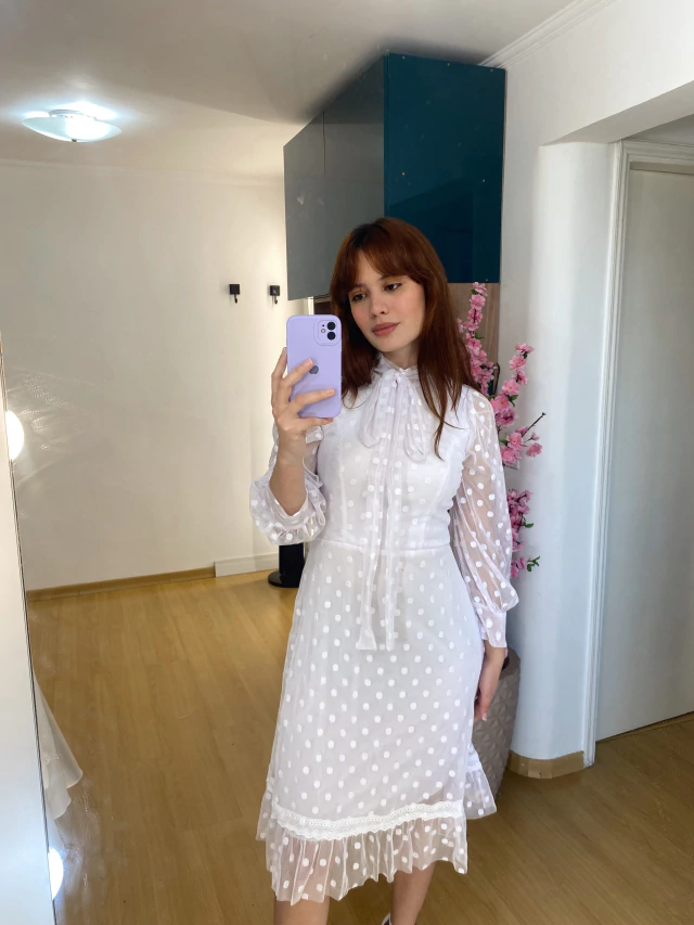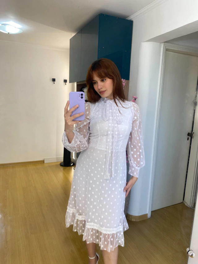 Romântico, elegante e superdelicado, este vestido foi pensado para iluminar momentos especiais. O tule poá (com bolinhas em relevo) traz textura e charme vintage, enquanto a gola laço permite diferentes amarrações — em laçarote, nó simples ou soltinha — para mudar o look sem esforço. As mangas longas levemente transparentes equilibram doçura e sofisticação, e o corpo forrado garante conforto e segurança ao vestir. Na barra, o babado com renda dá movimento suave, perfeito para fotos e para a celebração.