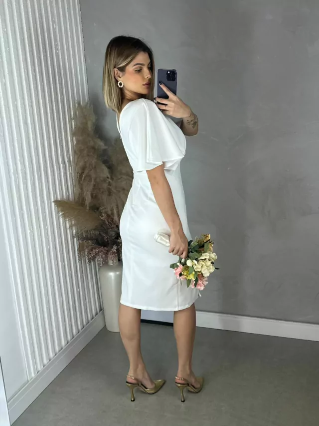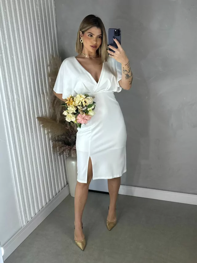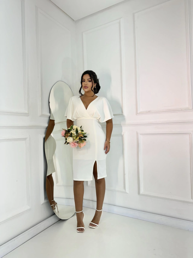 The Civil Wedding Dress with Midi Wrap Neckline is the perfect choice for modern and elegant brides. Featuring a crossed V-neckline, this dress delicately highlights the bride’s décolletage, adding a touch of sensuality to the look. The midi skirt with slit provides movement and flow, while the scuba-crepe fabric ensures a flawless drape.